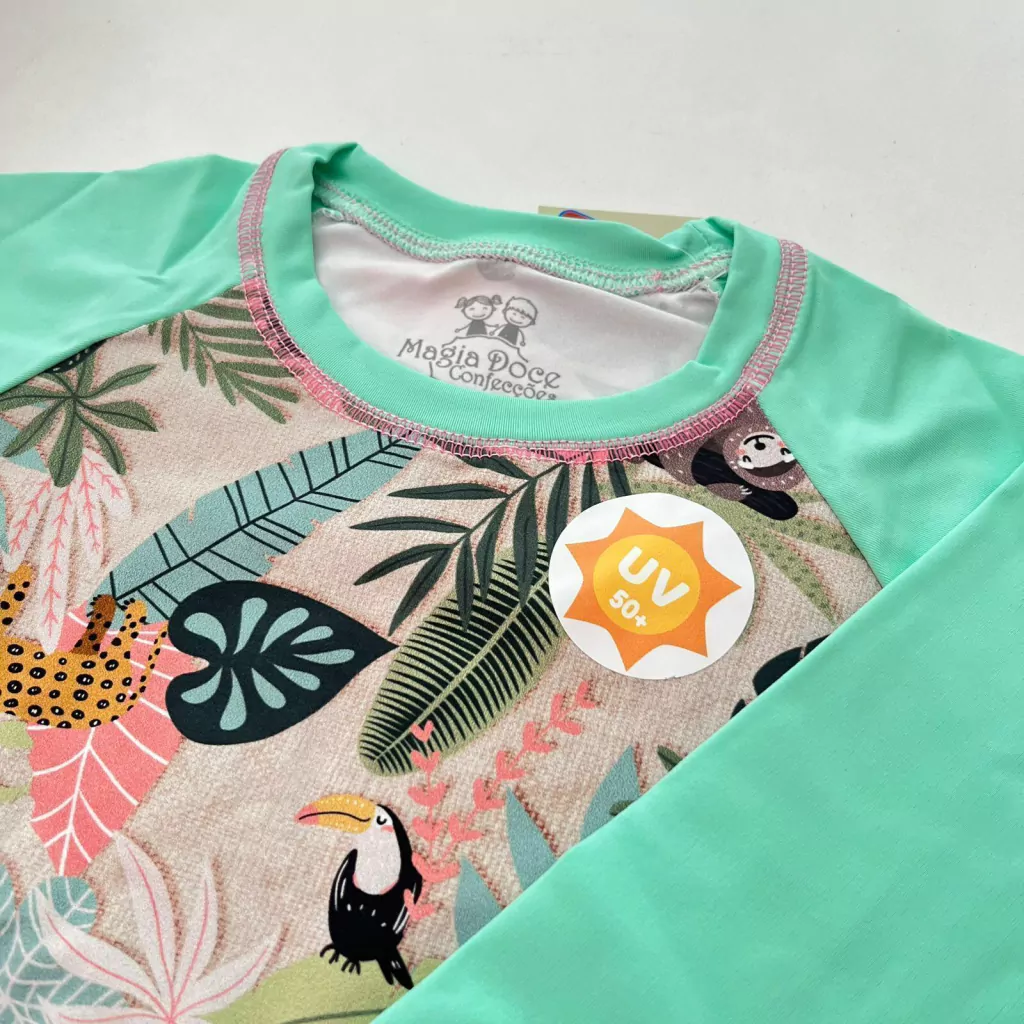 A estação mais colorida e ensolarada está chegando, e com ela vem aquela vontade de curtir uma praia, piscina e um parque né? Então, o conjunto com proteção UV é ideal para esses dias, dispensando aquele trabalhão de passar protetor solar. O tecido é poliamida, ele tem um toque bem fresquinho, e conta com uma tecnologia de proteção UV50+ que não sai com a lavagem!! Indispensável não é mesmo?!