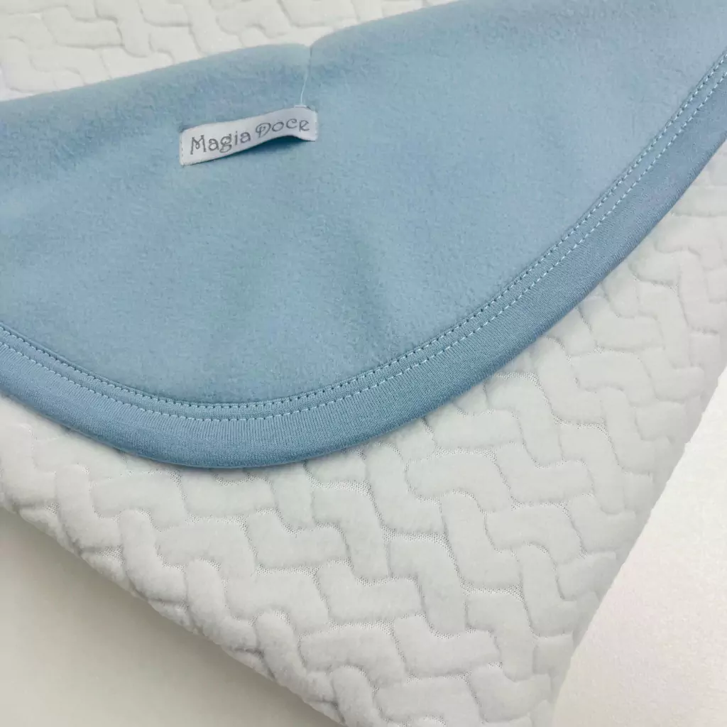 A manta soft dupla azul, é produzida em microsoft, de uma lado liso, já no outro também com microsoft porém com relevo, e seus acabamentos são em vies de algodão.Uma proposta para dias mais frios de inverno, que apresenta diversas qualidades, pois o tecido seca rápido, tem propriedades térmicas e também tecnologia anti-pilling, o que evita o aparecimento de bolinhas. Suas medidas são 90x110 cm., podendo ser usada para enrolar o bebê como também ser utilizada no berço.