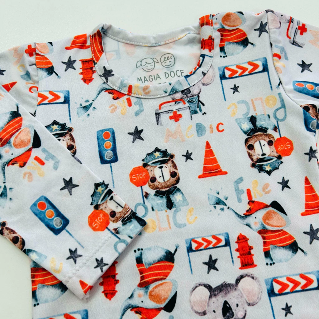 Produzido em tecido térmico, este conjunto é o queridinho da estação. O body na cor cinza claro, com uma divertida estampa de bombeiros, conta com botões de pressão na gola e na parte inferior, facilitando a troca. A calça, em azul marinho, possui elastico na cintura e punhos nas pernas, proporcionando um ajuste perfeito.